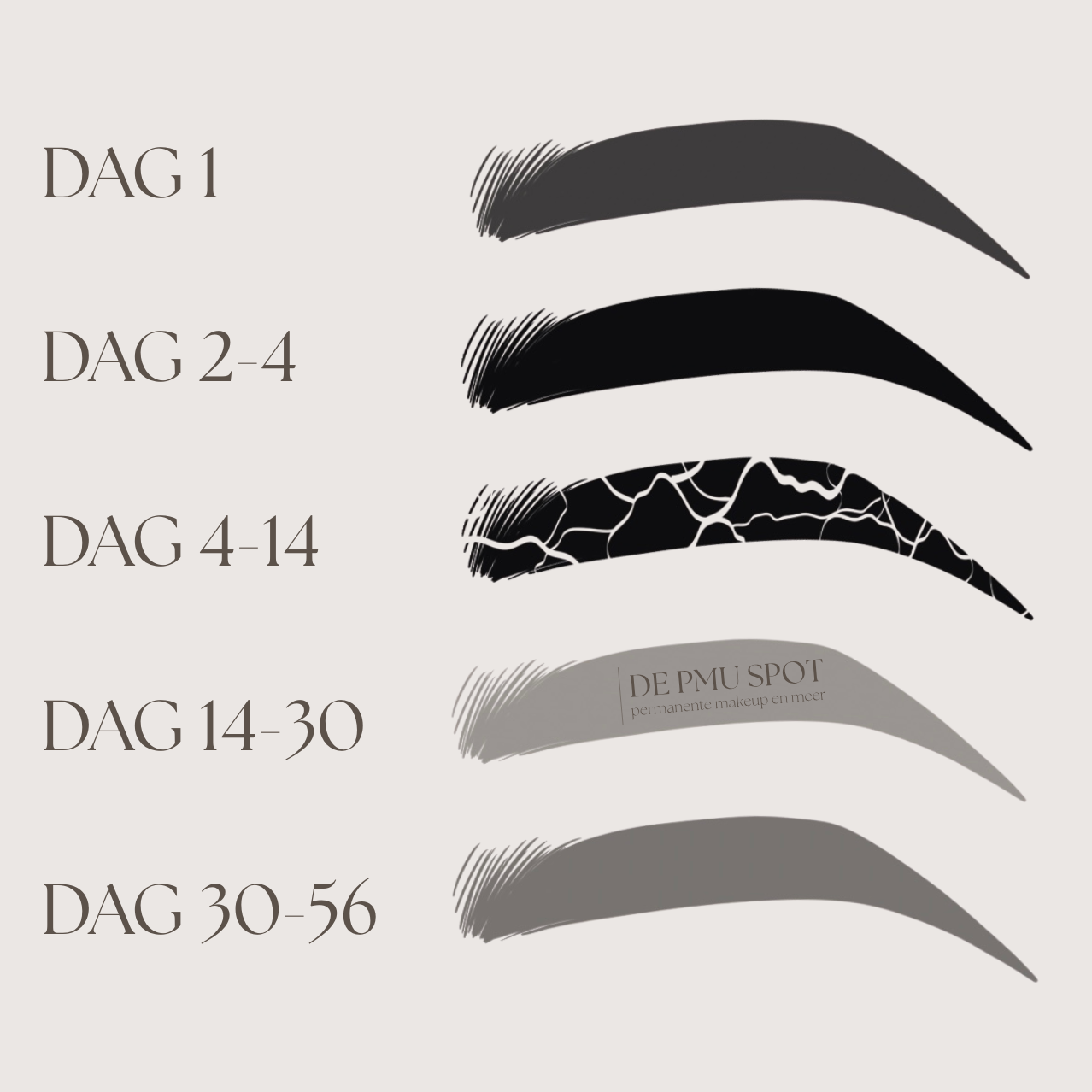 na de behandeling kan het voorkomen dat er nog een beetje vocht uit de huid komt. Met een schone tissue of licht vochtig wattenschijfje, kun je het vocht weg deppen (niet wrijven!). De kleur is de eerste 4 dagen het intenst. Na 4 dagen begint de huid te vervellen. Deze korstjes vallen er vanzelf af. Als alle korstjes er af zijn gevallen verdwijnt de kleur voor ongeveer 70%, wees niet bang, dit is niet het eind resultaat. Na ongeveer één maand komt de kleur nog ongeveer 20-30% terug. Na 6-8 weken is het tijd voor de retouch! Wanneer deze periode is verstreken kunnen we zien waar pigment eventueel niet genoeg heeft gepakt, of nog te licht is. Dit werken we bij tijdens de touch-up.
